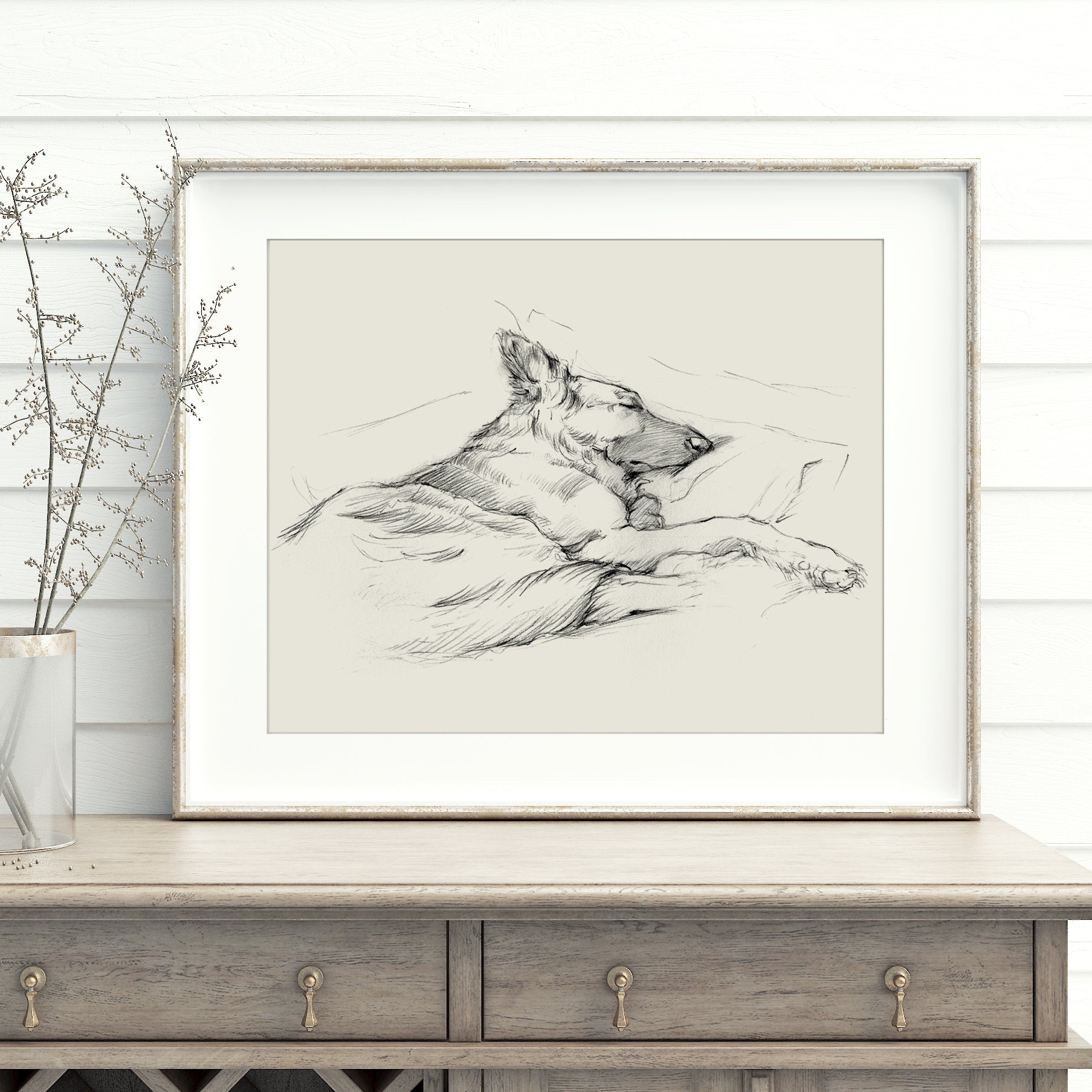 Enjoy the gentle charm of a German Shepherd at rest with this open-edition Giclée print by artist Ethan Harper. Celebrated for his ability to capture the essence of what it is to be a dog, Harper’s artwork beautifully reflects the loyalty, warmth, and spirit of this beloved breed. This print is a must-have for dog lovers and art enthusiasts looking to bring heartfelt character to their space.