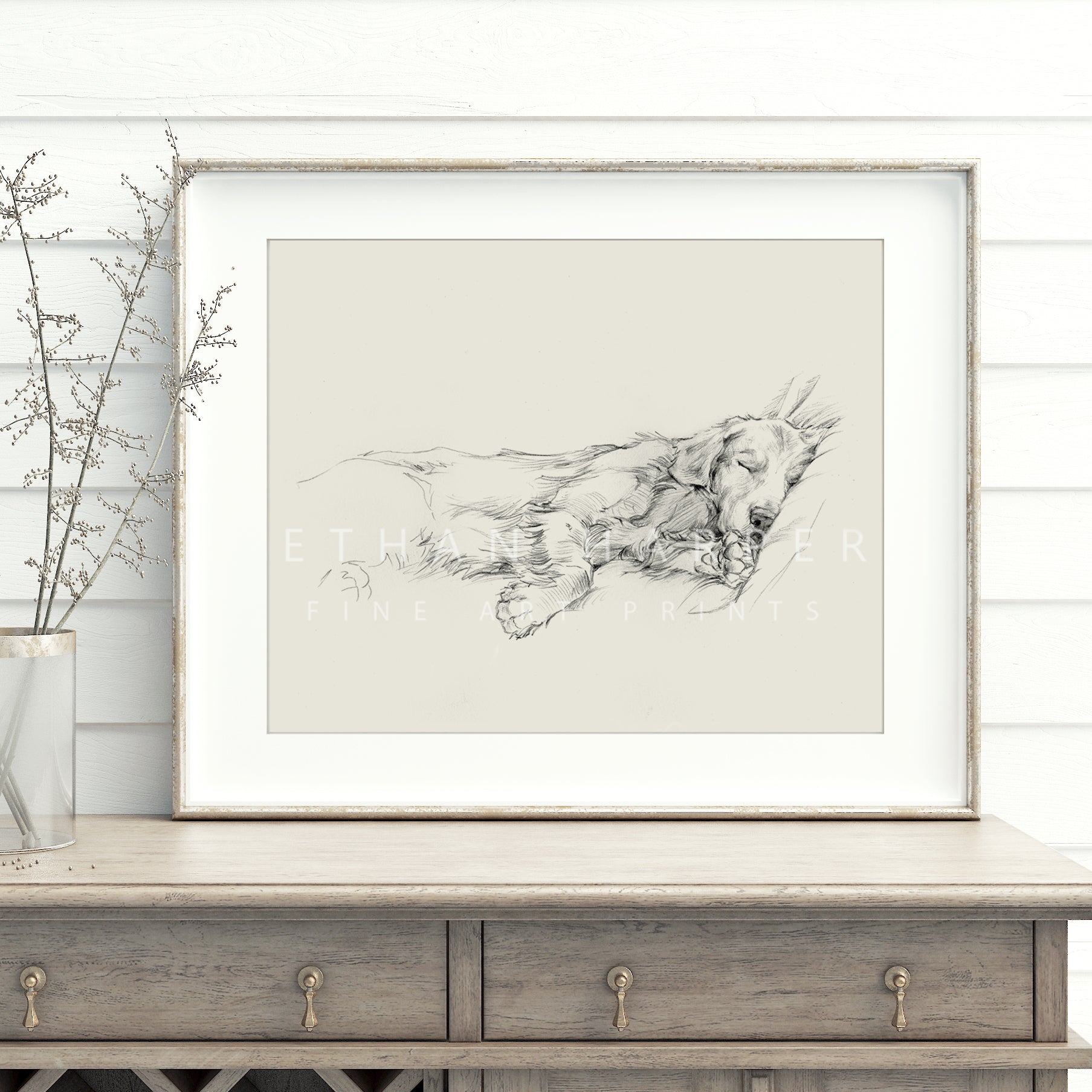This print, titled “Dog Days”, features an adorable pencil sketch of a dog doing what dogs do best; napping the day away! This is an Open Edition print of an original pencil drawing by artist Ethan Harper